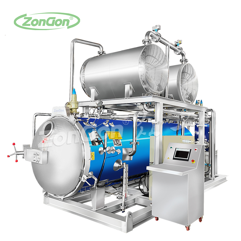 新含氣調(diào)理殺菌鍋(又稱新氣調(diào)殺菌釜)是集惰性氣體置換包裝+溫和式高溫高壓殺菌+精準(zhǔn)控溫控壓于一體的食品加工核心設(shè)備。先將食品密封包裝時(shí),用氮?dú)?/ 二氧化碳混合氣體置換掉包裝內(nèi)的氧氣(殘氧量可控制在極低水平);再通過(guò)波浪狀熱水噴淋、多階段升溫、快速冷卻的工藝,在殺滅致病菌與腐敗微生物的同時(shí),最大限度保留食品原有的色澤、風(fēng)味、口感與營(yíng)養(yǎng),無(wú)需添加防腐劑,常溫下即可實(shí)現(xiàn) 6–12 個(gè)月的長(zhǎng)貨架期。